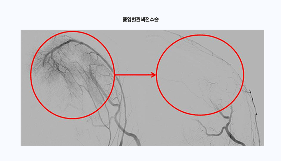 신경계 종양의 수술 전단계에서는 종양에 분포하는 혈관의 정도와 종양 주위 혈관과의 관계를 확인하기 위해 혈관조영술을 시행하기도 한다. 대개 종양에 대한 치료원칙은 완전 제거하는 것인데 종양의 위치나 주위 신경, 혈관과의 관계로 인하여 완전 절제가 불가능하기도 하고 수술 시에 출혈이 많이 발생하기도 한다. 이런 치료의 전후에 종양에 피를 공급하는 영양혈관을 막는 색전술을 시행함으로써 종양제거 수술 시 출혈을 감소시키고 종양의 크기가 축소된 상태에서 수술 등의 치료가 이루어 질 수 있도록 한다. 치료대상이 되는 뇌종양은 뇌수막종이 대표적이며 다른 종류의 과혈관성 종양에도 시술을 고려할 수 있다.