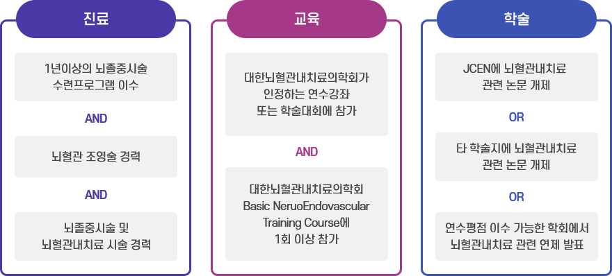 - 뇌졸중시술 인증의라 함은 대한뇌혈관내치료의학회 정회원으로서 뇌졸중시술 및 뇌혈관내치료 분야에서 많은 경험을 축적하여 대한뇌혈관내치료의학회가 인정하는 소정의 자격 요건을 충족하는 자로서 학문적 또는 의료 기술적으로 급속히 발전하는 뇌졸중시술 및 뇌혈관내치료 영역에서 양질의 수준 높은 전문적 의료를 수행할 수 있다고 대한뇌혈관내치료의학회가 인증하는 임상 의사를 말한다.