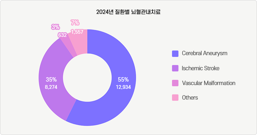 대한뇌혈관내치료의학회는 2025년 현재 1500 여 명의 회원 및 310명의 인증의와 112곳의 인증병원을 배출하여 명실상부하게 대한민국의 뇌혈관내치료분야를 대표하는 학회로 성장을 하였습니다. 우리 학회의 회원은 우리나라 뇌졸중 치료의 최일선에서 환자 치료에 묵묵히 헌신하여 왔고, 우리 학회는 이러한 노력의 결과인 회원들의 진료업적을 2013년 부터 자료화 및 통계화하여 왔습니다. 이 통계는 우리 학회뿐 만 아니라 우리나라 뇌졸중 치료 및 연구의 중요한 자료이며, 학회는 앞으로도 회원들의 진료 통계를 소중히 취합하여 자료화 하겠습니다.