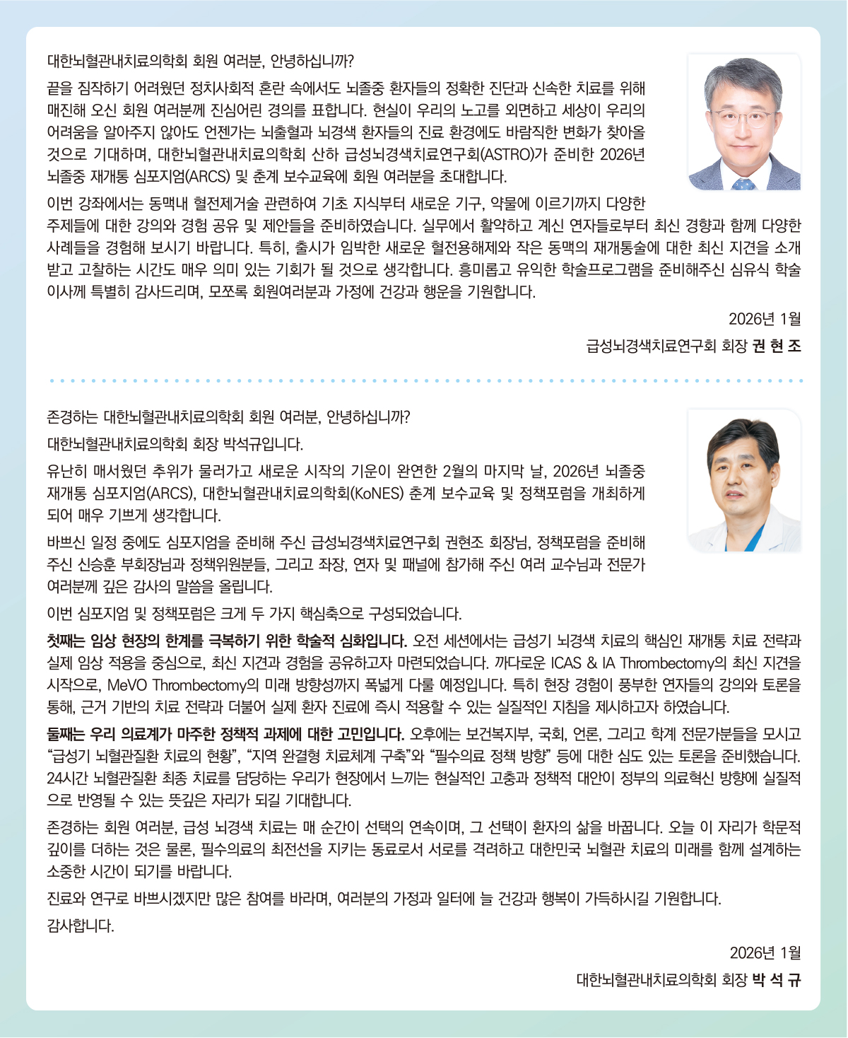 끝을 짐작하기 어려웠던 정치사회적 혼란 속에서도 뇌졸중 환자들의 정확한 진단과 신속한 치료를 위해 매진해 오신 회원 여러분께 진심어린 경의를 표합니다. 현실이 우리의 노고를 외면하고 세상이 우리의 어려움을 알아주지 않아도 언젠가는 뇌출혈과 뇌경색 환자들의 진료 환경에도 바람직한 변화가 찾아올 것으로 기대하며, 대한뇌혈관내치료의학회 산하 급성뇌경색치료연구회(ASTRO)가 준비한 2026년 뇌졸중 재개통 심포지엄(ARCS) 및 춘계 보수교육에 회원 여러분을 초대합니다.